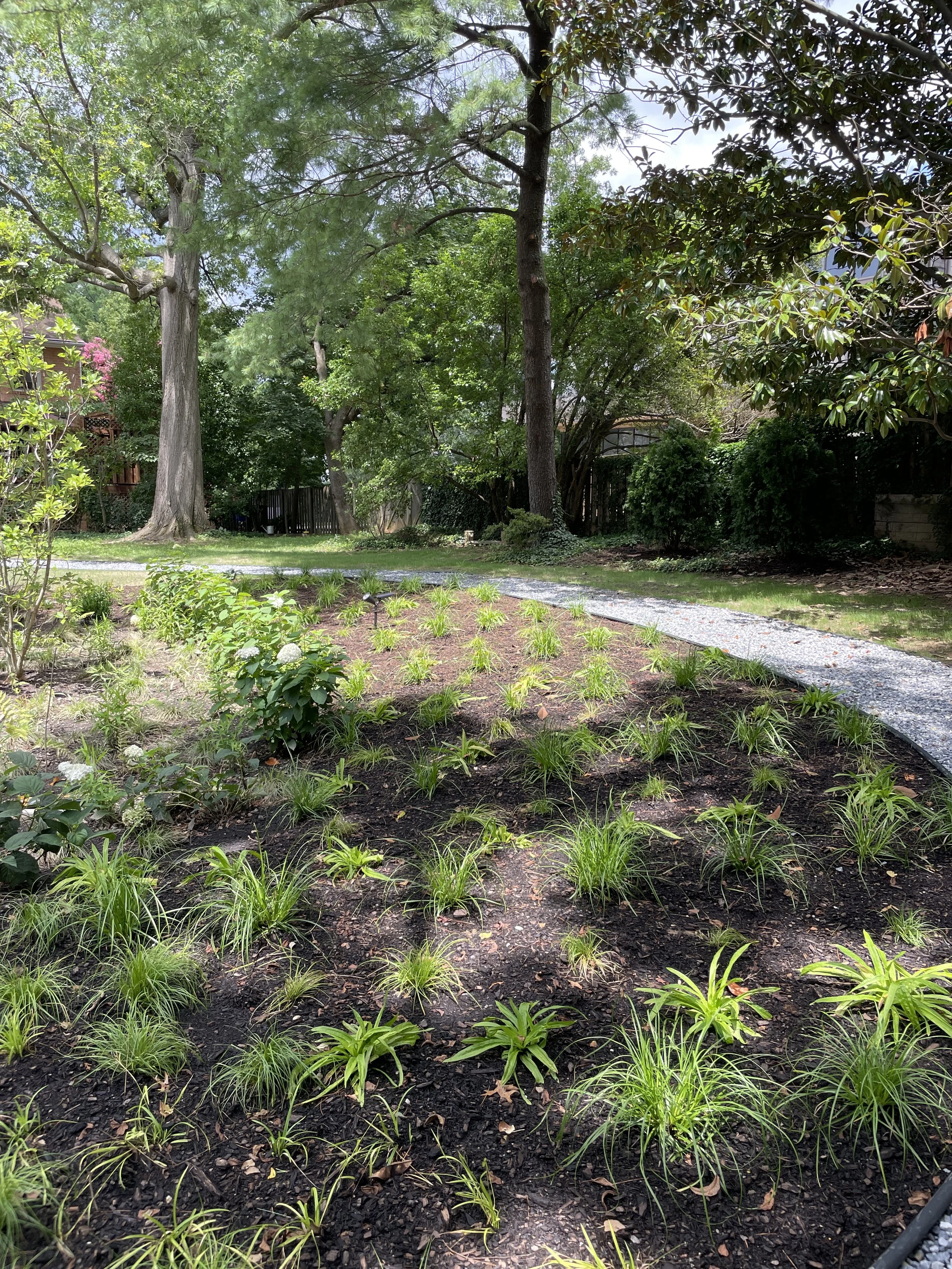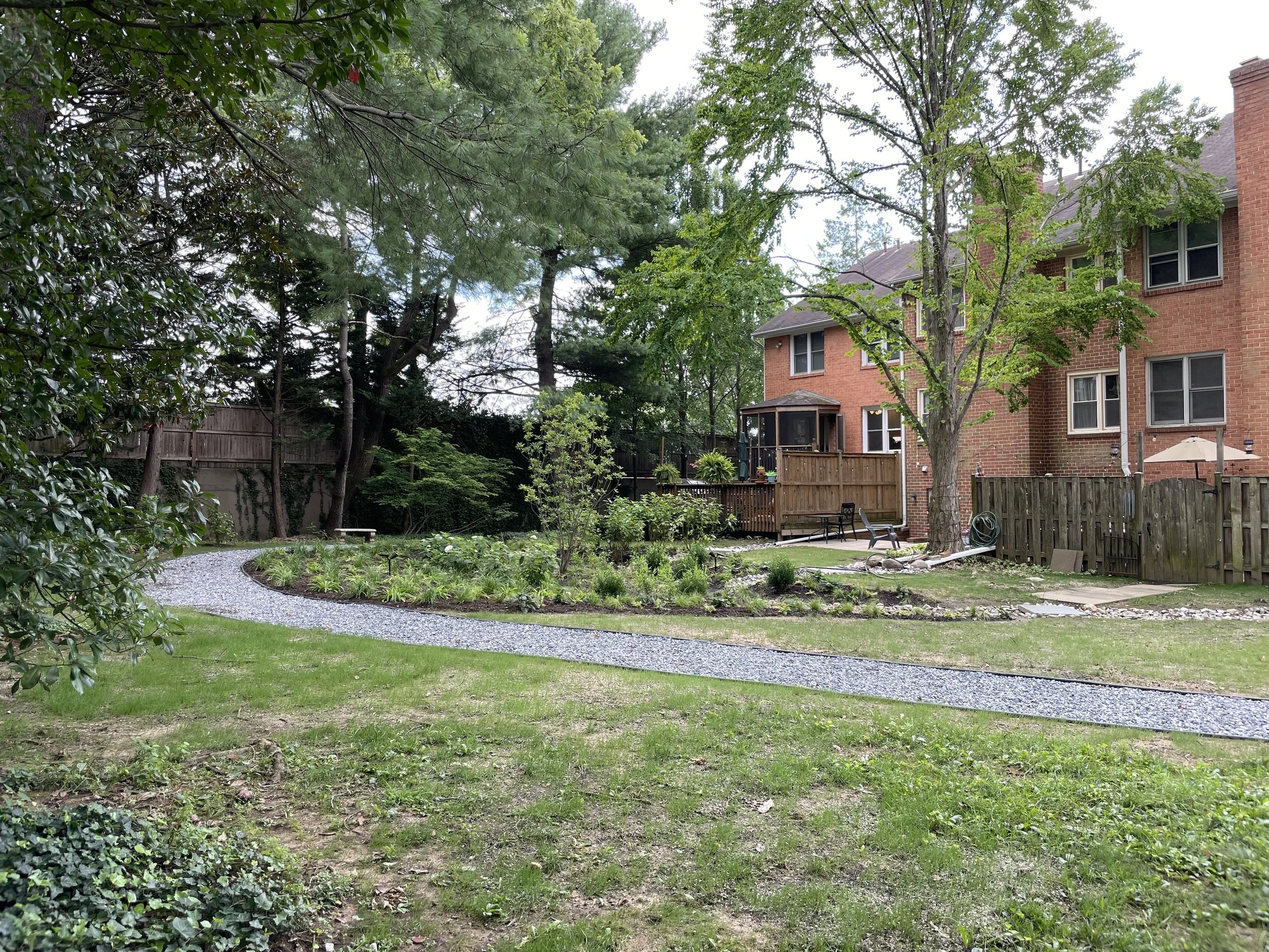 Working with Montgomery County environmental non-profit, Bethesda Green, the design team developed a bioretention basin that could accept all of the runoff from the existing roofs and filter the water as it infiltrates into the soil and recharges the groundwater. The regrading of the site creates low areas for water management and higher areas that remain dry for socialization and relaxation in nature. The selective thinning of the aging and dense tree canopy create new areas of light for native plants to thrive.
